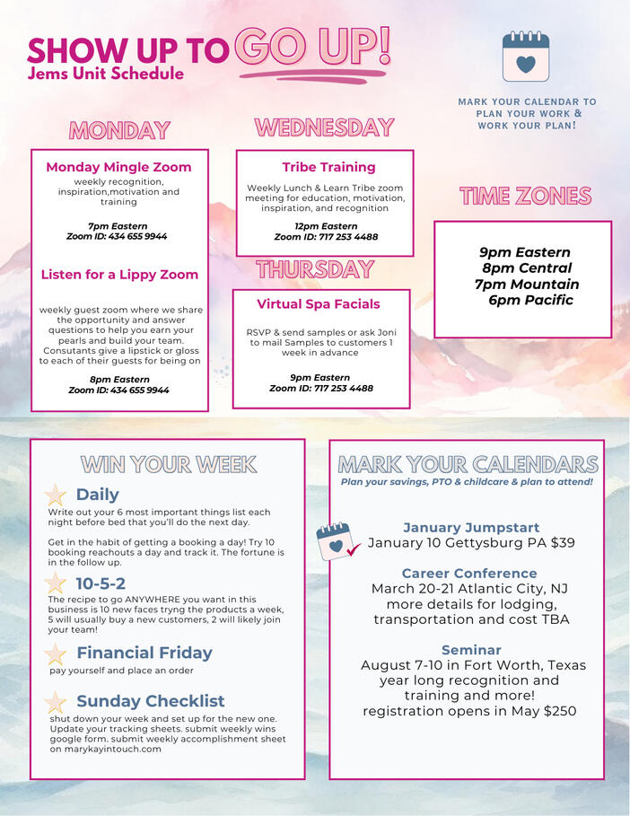 Mary Kay always said, “When you’ve had a GOOD week, the meeting needs You! When you’ve had a bad week, YOU NEED THE MEETING!”Weekly Success nights are packed with great training, women, and tons of tips to build a successful business around your life. Mary Kay Ash always said never to miss a meeting or event unless you had one of the 4 D’s: Death, Dilation, Doctors note, or Deployment. Weekly meetings are not mandatory but it is important not to miss them. Those that show up – go up in their business!