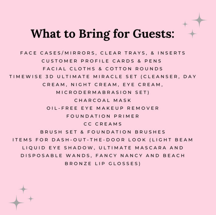 4. Eye cream in pouch 4.The normal/dry formula coordinates with the pink name tag and ribbon and purple with combination to oily.Referrals and think pink opinion survey.During the party when I do referrals I hand out this paper and ask her to do the think pink on the back while I do the individual closes with everyone.I put the 2nd date/half back coupon at their place setting. I talk about it during their appt. This encourages sales and new skincare customers and also rebooking that day! Encourage her to invite the ladies she put down as referrals!