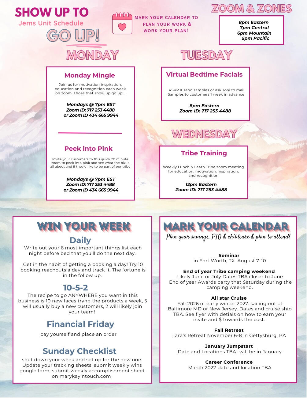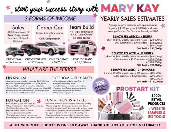 .Mary Kay always said, “When you’ve had a GOOD week, the meeting needs You! When you’ve had a bad week, YOU NEED THE MEETING!”Weekly Success nights are packed with great training, women, and tons of tips to build a successful business around your life. Mary Kay Ash always said never to miss a meeting or event unless you had one of the 4 D’s: Death, Dilation, Doctors note, or Deployment. Weekly meetings are not mandatory but it is important not to miss them. Those that show up – go up in their business!