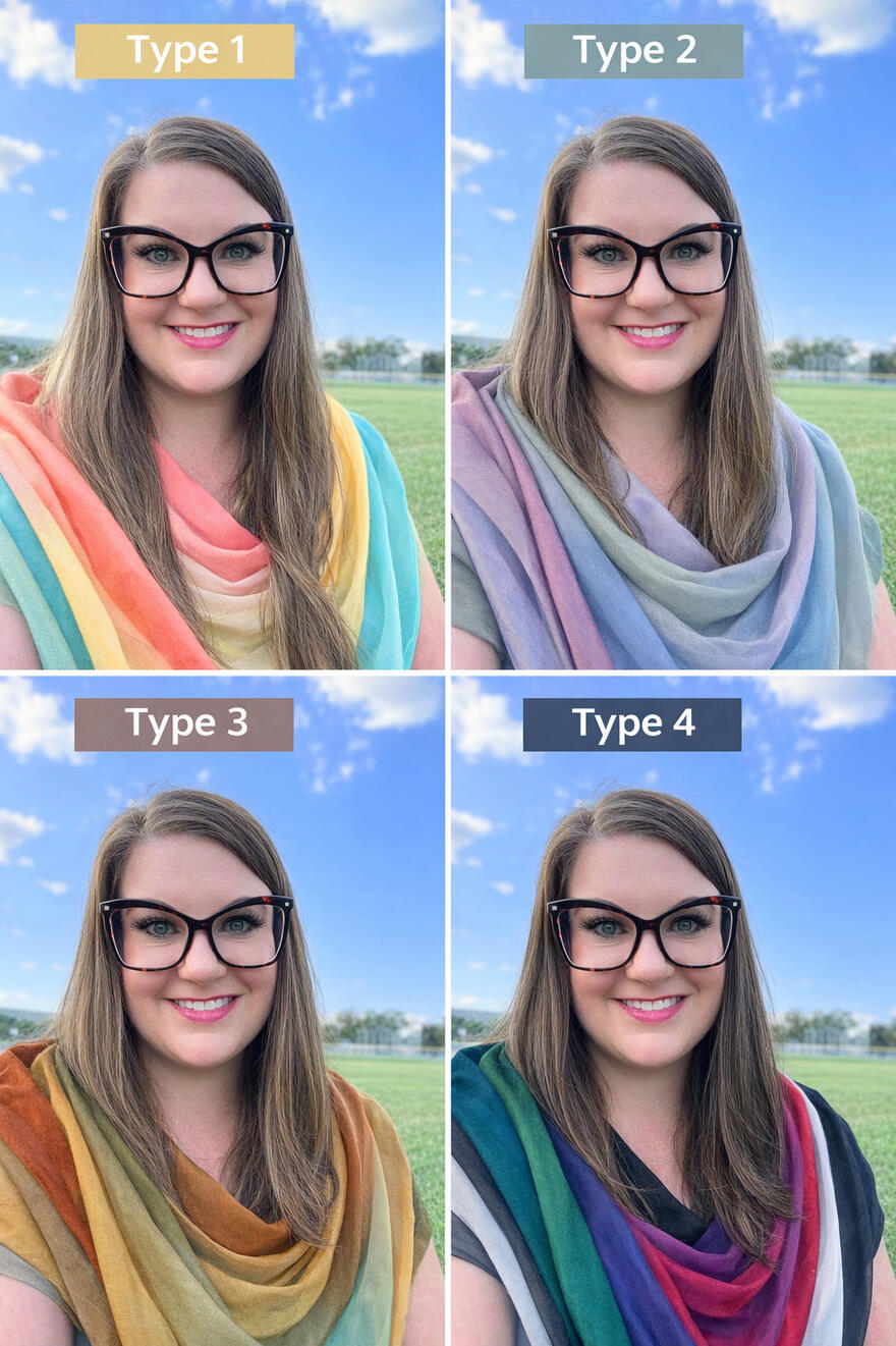 Use my photo to create a 4-panel color analysis image using the Dressing Your Truth system (Types 1–4).Arrange it in a 2x2 grid: