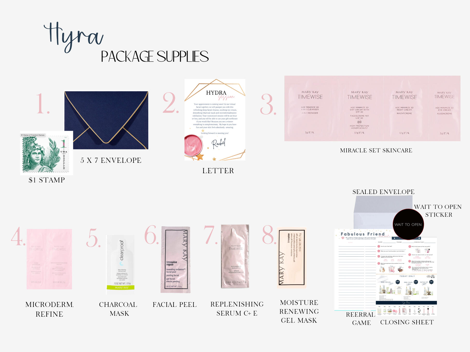 Each mirror should be packed with a clear disposable tray, throw away washcloth, pen and 2 cotton rounds.I would recommend having 1 of each skin care diagram printed in color, double sided for each face tray. these won't ever be thrown away, you just put the clear tray over them for each appointment and switch it based on which skincare you customer is trying. Use coordinating set closing sheets. Color-coded for ease of use!I would also suggest getting: